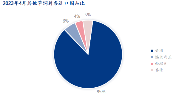 2023年4月其他草饲料进口国主要为:美国、澳大利亚、西班牙、南非、加拿大、阿根廷、苏丹、哈萨克斯坦、英国等。其中美国为第一进口国家,占总进口量的85.66%,其余国家进口量之和占总进口量的14.34%。从美国进口的数量为50653.738吨,占比85.66%,从澳大利亚进口的数量为3494.561吨,占比5.91%,从西班牙进口的数量为2197.360吨,占比3.72%,其他国家进口总量为2789.011吨,其余国家进口量之和占到总出口量的4.63%。