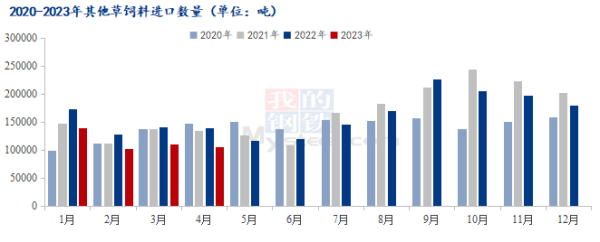 2023年其他草饲料1-4月份其他草饲料总进口数量为457351.694吨,较去年同期较少123205.933吨,降幅21.22%。进口量较去年同期呈现小幅下调趋势,受其他草饲料供应相对较为充足,需求支撑力度弱等因素影响,预计短期内市场震荡运行,Mysteel农产品认为后续继续关注库存的消耗及下游需求。