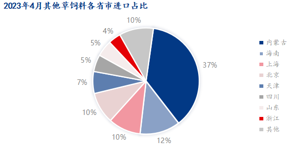 从2023年4月进口省份来看,其他草饲料的进口的主要省市以内蒙古、海南、上海、北京、天津、四川、山东、浙江等省市为主,这几个省份就占全国总进口量的90%。其中内蒙古进口总量为39418.052吨,占4月总进口量的34.80%;海南进口总量为12965.3吨,占4月总进口量的11.45%;上海进口总量为10410.694吨,占4月总进口量的9.19%;北京进口总量为10103.002吨,占4月总进口量的8.92%;天津进口总量为7045.379吨,占4月总进口量的6.22%,四川进口总量为5450.388吨,占4月总进口量4.81%,山东进口总量为5236.71吨,占4月总进口量4.62%,浙江进口总量为4006.408吨,占4月总进口量3.54%,其他省市进口总量为11004.067吨,占4月总进口量的9.71%。